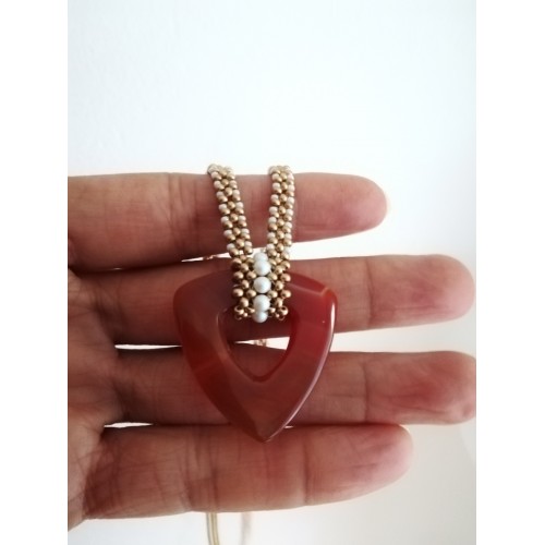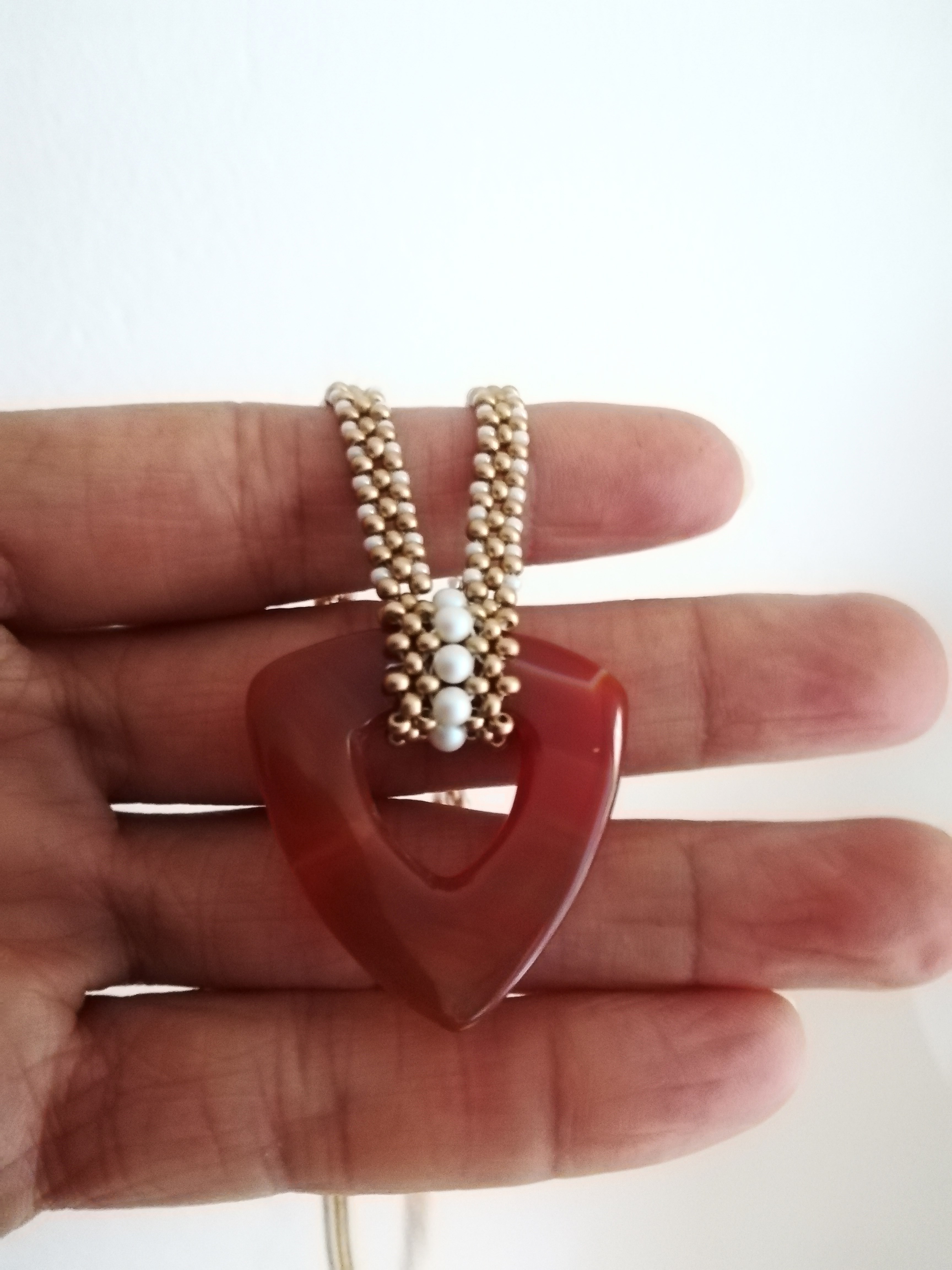 Collier cornaline fait main. Collier pierre que j'ai fais à la main en mini perles de rocailles dorées satinées, mini perles de rocailles blanc perle, perles nacrée Swarovski et pierre cornaline de forme triangulaire. Fermoir mousqueton acier inoxydable doré.